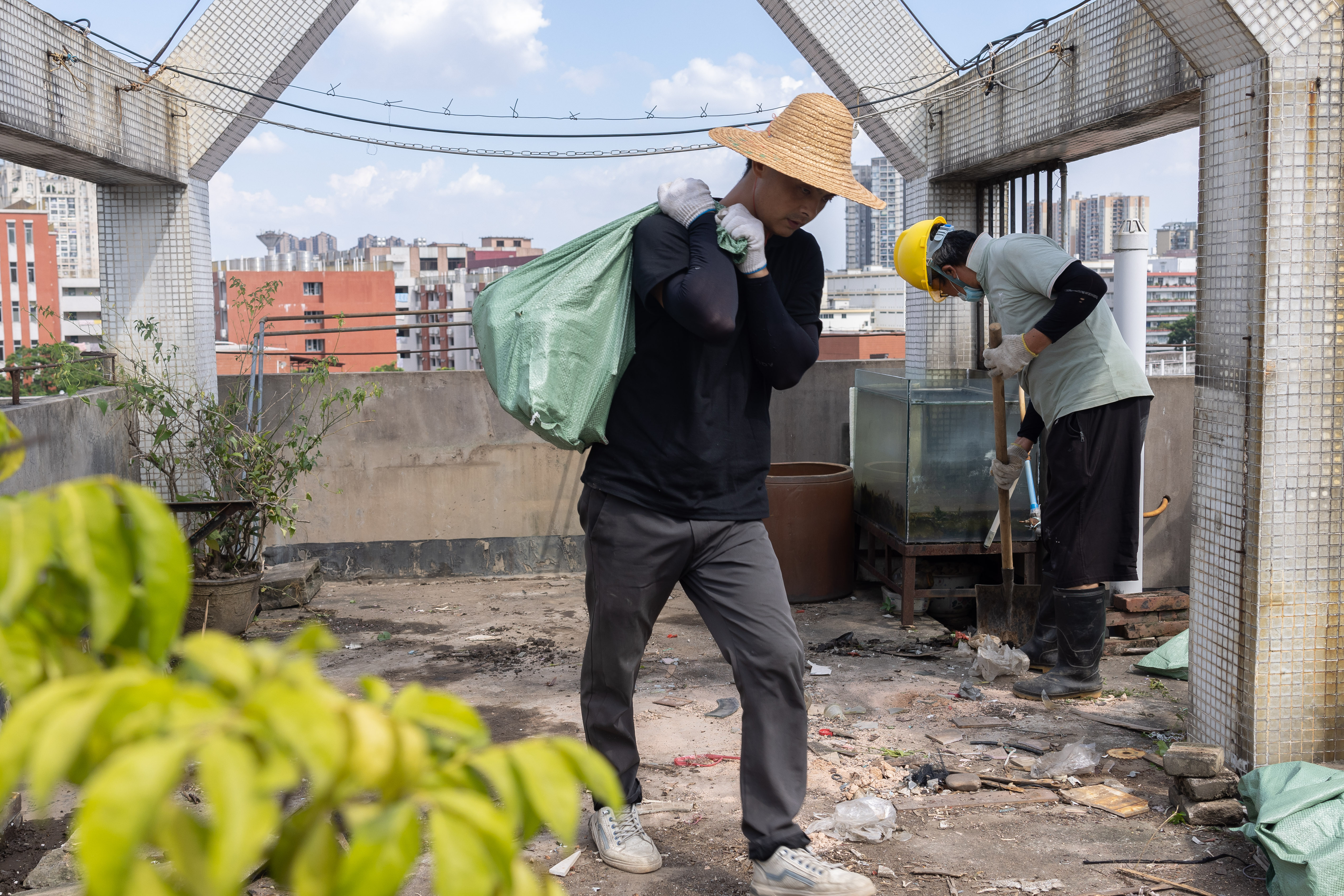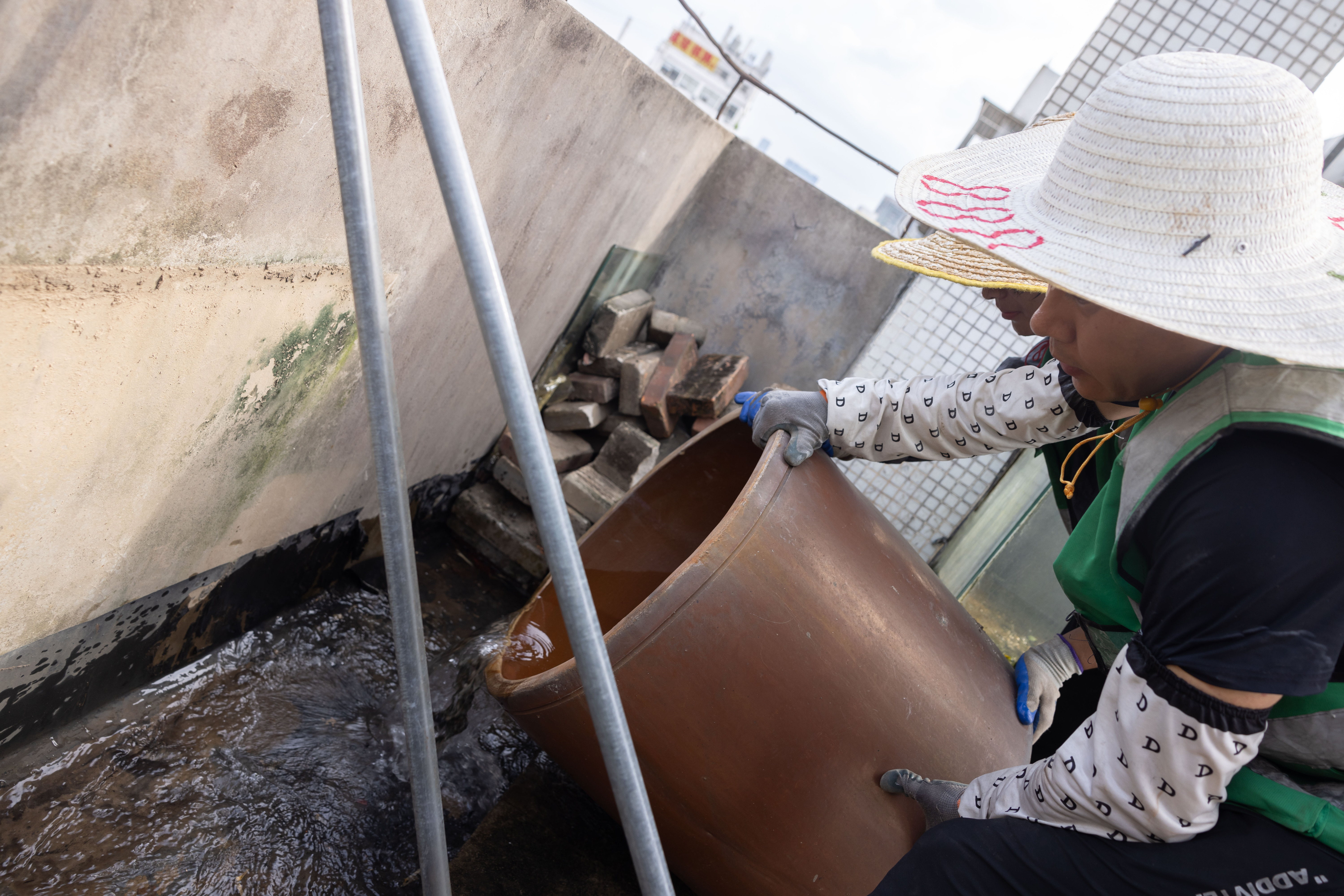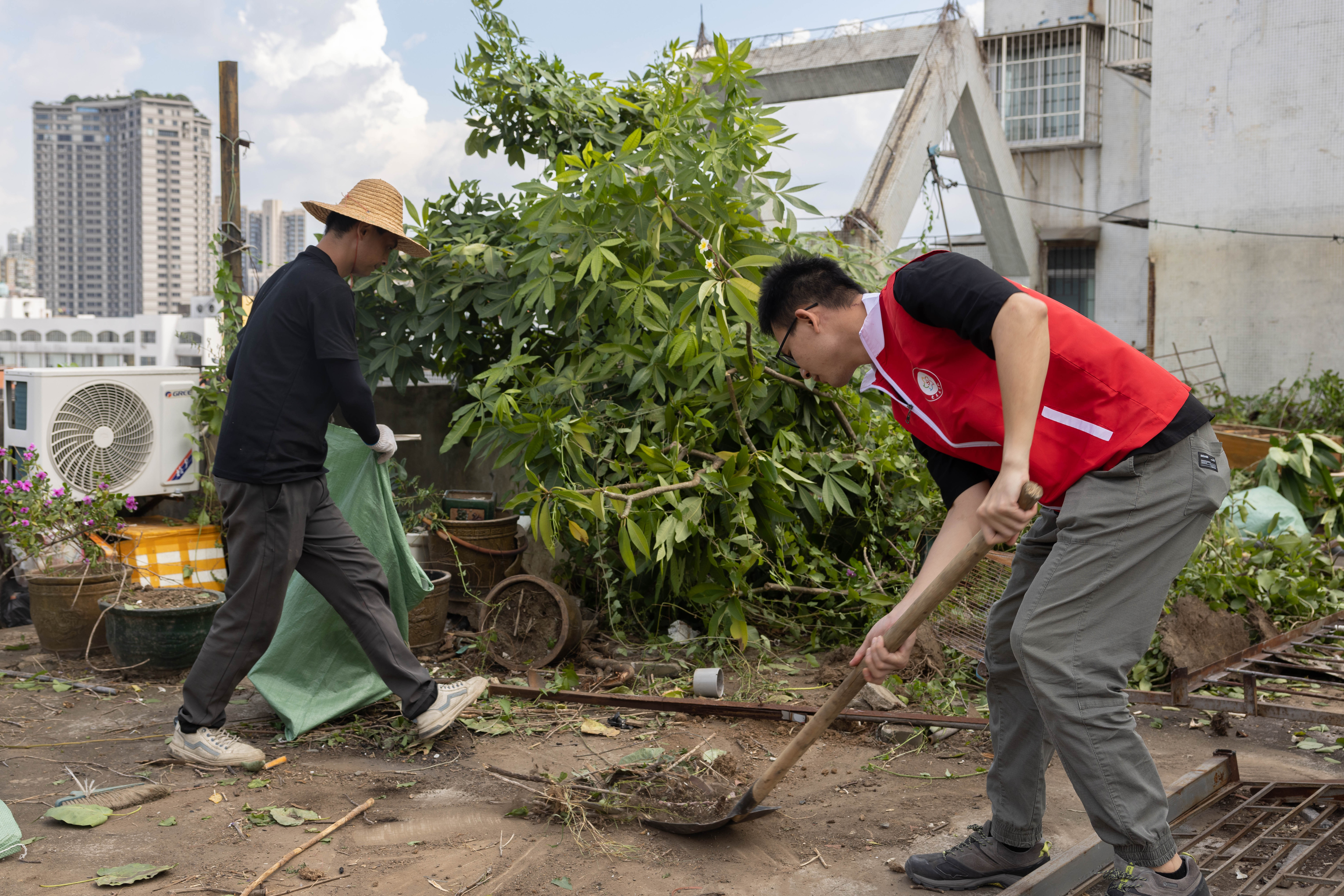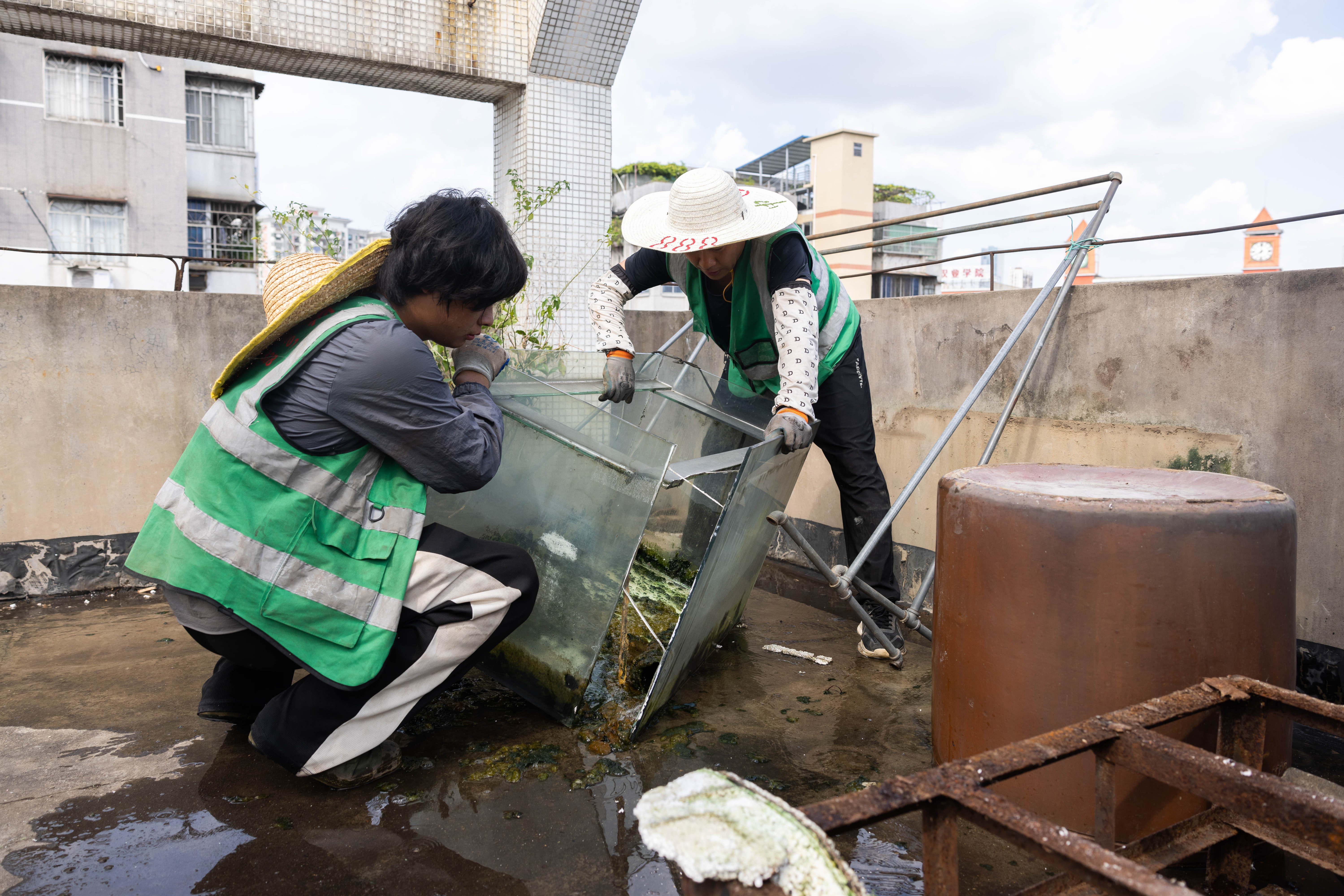 顶着炎炎烈日,在老旧楼顶,工作人员肩扛鼓鼓的绿色编织袋稳步前行,身旁的队友正弯腰清理积水的鱼缸和盆栽,防止蚊虫滋生;另一边,大家挥动铁锹、铲除杂草,仔细查看屋顶积水,协力将陶缸中的存水倒入排水沟。